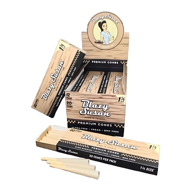 Upgrade your rolling station with the Blazy Susan 1-1/4 Size 20PK Cones – 12CT Box, crafted for smooth, flavorful sessions with the perfect personal-size pre rolls. Made from ultra-thin rice paper and finished in signature pink, these pre-rolled cones bring style and consistency to your smoking experience.