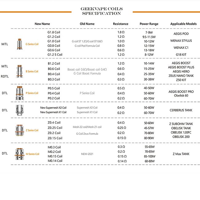 Z0.4 COIL: 0.4OHM MESH Z1 COIL – RATED 60-70W [NOTE: THE OLD PACKAGING HAVE A RANGE OF 50-60W] Z0.2 COIL 0.2OHM MESH Z2 COIL – RATED 70-80W Z0.15 COIL 0.15OHM COIL – RATED 80-90W Z0.25 COIL 0.25OHM COIL – RATED 45-57W