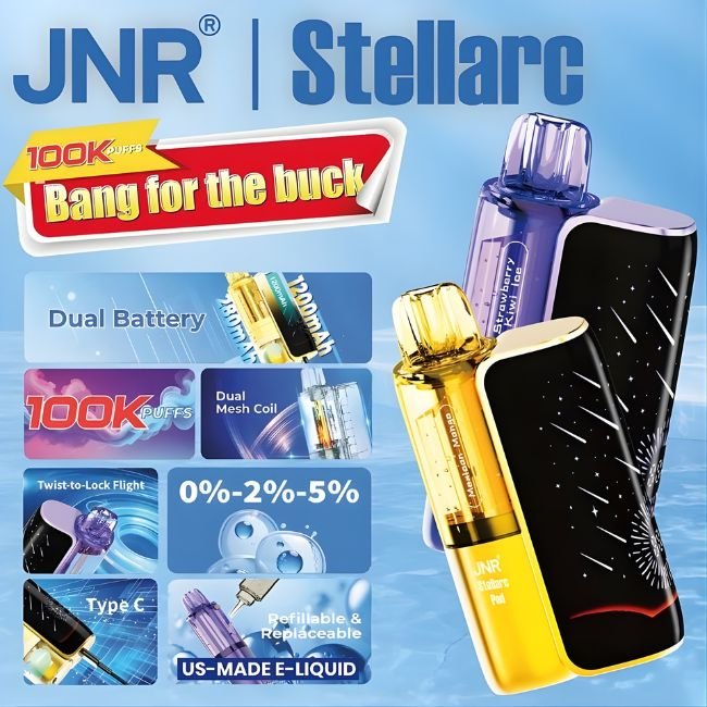 JNR STELLARC 5% DISPOSABLE KIT (150ML) 100K PUFFS 5CT/ BOX (2 BOTTLES OF E-LIQ INCLUDED)