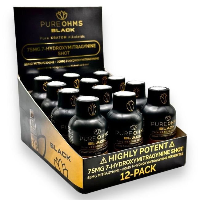 Pure Ohms Black 7-HydroxyMitragynine 75MG 60ML Extract Shot – 12CT/Box