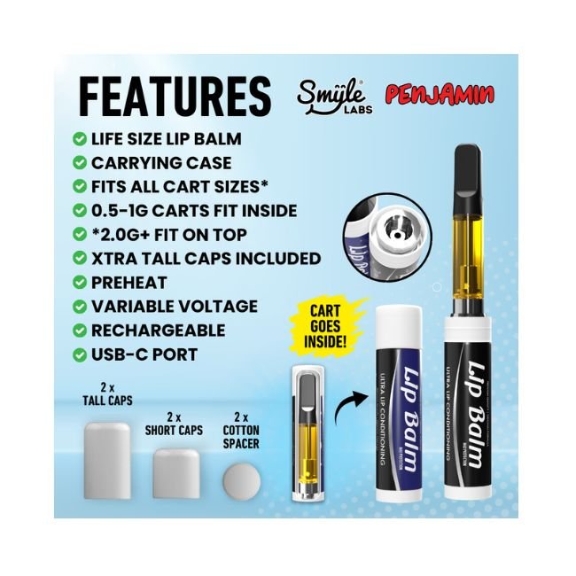 The SMYLE PENJAMIN CHAPSTICK 400mAH CART BATTERY 5CT/BOX is the perfect solution for those seeking a portable, reliable, and stylish vape battery. With a 400mAh battery capacity, this pen provides ample power for your vaping needs while its compact chapstick design ensures easy portability. Choose from three vibrant color combinations—Black & Blue, Black & Red, or Red & Pink—to suit your style. Whether you’re new to vaping or a seasoned enthusiast, the SMYLE PENJAMIN offers a smooth, consistent experience with every use. Grab a box of 5 and elevate your vaping experience with the reliable performance and sleek design of the SMYLE PENJAMIN battery.